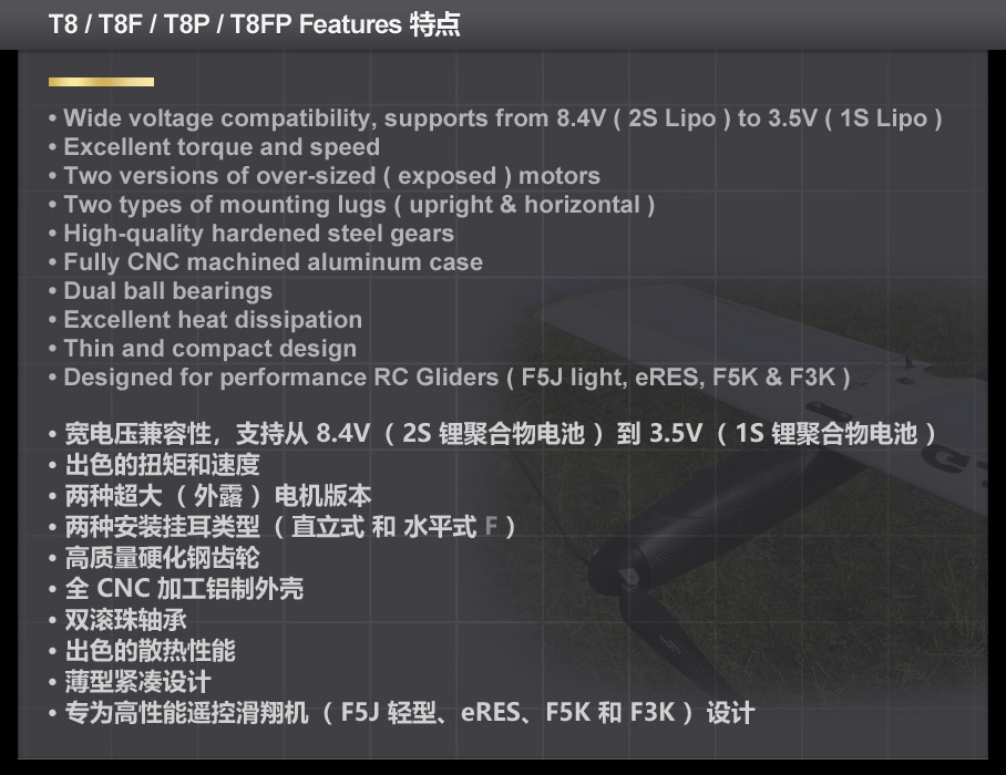 • Designed for performance RC Gliders(F5J light, eRES, F5K & F3K)