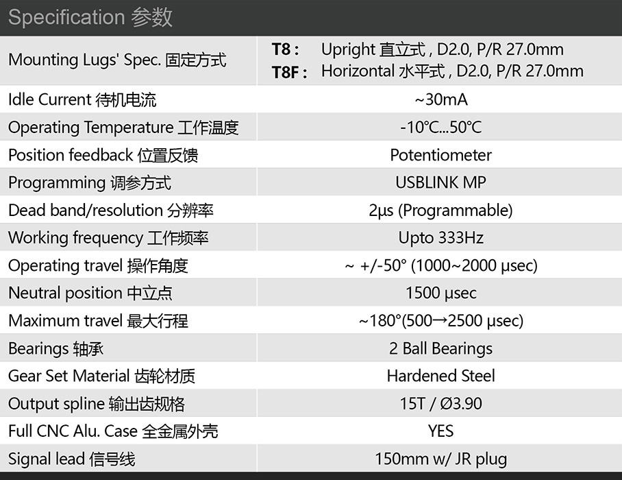 (3.3V) 1.0 Kg·cm, 0.18 sec/60° (3.8V) 1.3 Kg·cm, 0.16 sec/60° (6.0V) 2.0 Kg·cm, 0.12 sec/60° (7.4V) 2.6 Kg·cm, 0.09 sec/60° (8.4V) 3.0 Kg·cm, 0.08 sec/60° |